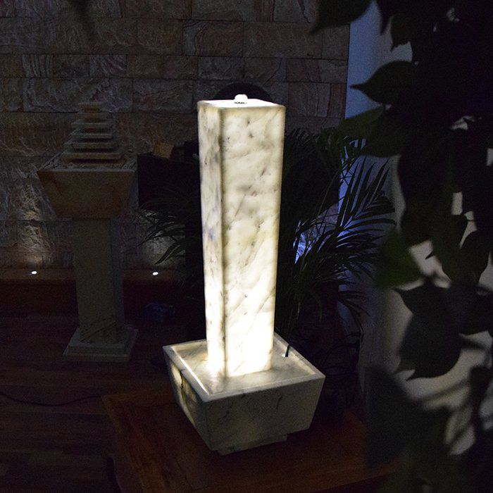 Hellgraue Linien bzw. Maserungen durchziehen den weißen Carrara Marmor und in Kombination mit der innenliegenden LED Beleuchtung entsteht ein sehenswürdiges Licht- und Wasserobjekt. Die besondere Verarbeitungstechnik bringt mystische Bilder aus dem Stein hervor, während außen das Wasser herabfließt.